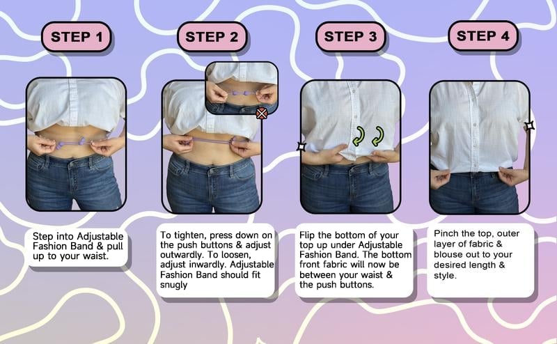 • Tuck our oversized shirts into our pants/waistband: instead of tucking your oversized tops into your pants, just tuck them into an adjustable elastic band, blouse, and you're done. You no longer have to repeat your clothes every time you go to the toilet. And no more bulkiness in the front of your jeans or leggings.